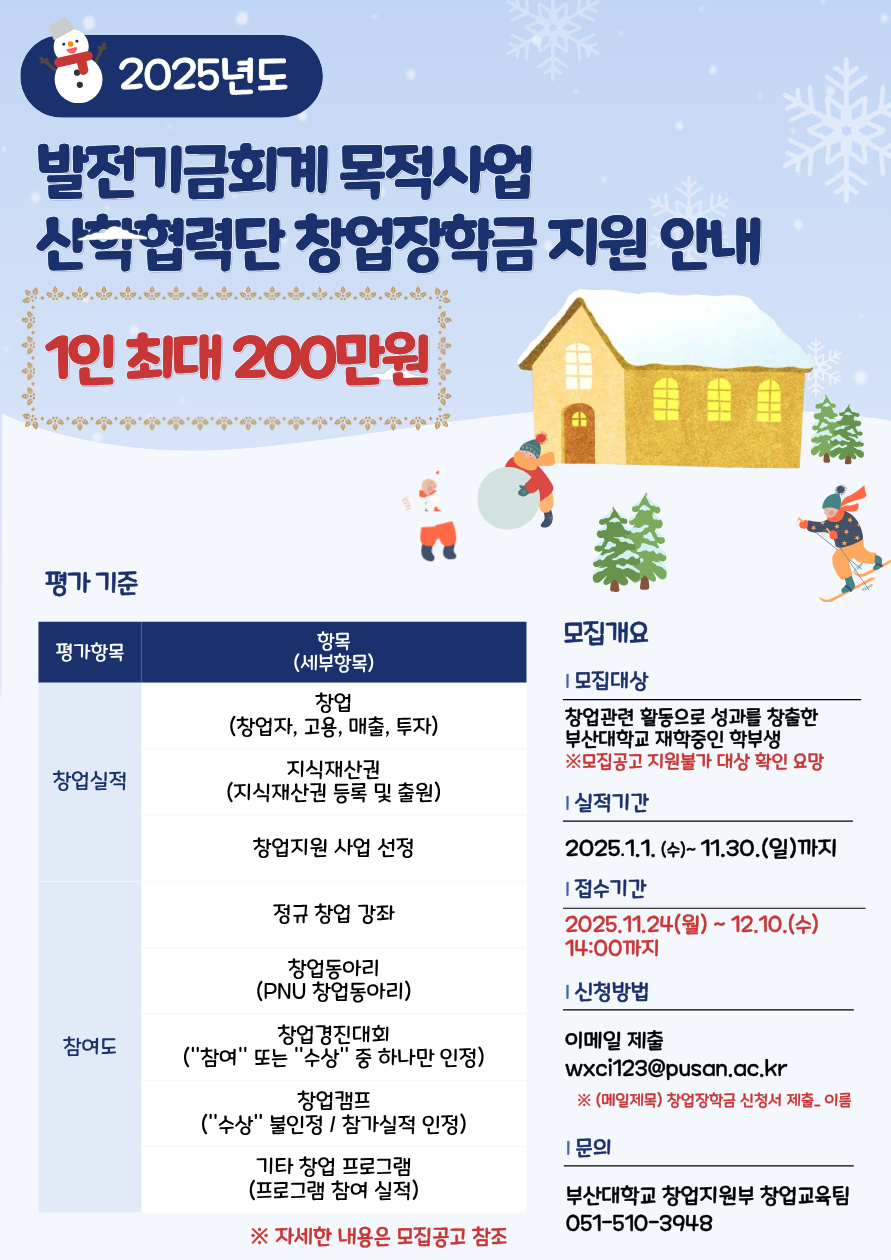 fnctId=bbs,fnctNo=4167 [장학·멘토링] 2025년도 발전기금회계 목적사업「산학협력단 창업장학금」안내 date 2025.11.27 name 고고학과 e-mail view 25 첨부파일 붙임 1. 2025년도 발전기금회계 목적사업 산학협력단 창업장학금 모집공고.pdf 미리보기 붙임 2. 2025년도 발전기금회계 목적사업 산학협력단 창업장학금 신청서.hwp 미리보기 말머리 분류 전체 학사 졸업 장학·멘토링 취업 내규 교류·파견 홍보·안내 RSS 2.0 2997 건 게시물 검색 검색하기 제목 작성자 게시글 리스트 공지사항 번호 제목 작성일 첨부파일 조회수 전체공지 부산대학교 교직원 사칭 사기 사례 전파 및 피해 예방을 위한 안내 2025.12.18 1 전체공지 시월광장 넉넉한터 잔디 보호 및 재생을 위한 사용통제 안내 2025.12.18 0 공지 2026년 2월 졸업 예정자에 대한 표준외국어능력시험 성적표 제출 마감일 안내 2025.12.18 0 전체공지 2026학년도 1학기 학·석(박)사 (통합)연계과정 학생 및 전환 희망 학생 모집 안내 2025.12.17 3 전체공지 2026학년도 1학기 휴·복학 신청 기간 안내 2025.12.17 0 공지 2026학년도 부산대학교 예비 신입생 캠퍼스 투어 신청 안내 2025.12.10 2 전체공지 [채널PNU] [알쓸부잡] EP 08. 부산대 박물관 학예사(강나리 동문) 편 안내 2025.11.27 0 전체공지 시험 질서 확립을 위한 안내문 2025.11.26 0 공지 2026년 1학기 국가장학금 1차 신청 안내 2025.11.18 2 공지 2026학년도 1학기 국가근로장학금 1차 신청 안내 2025.11.18 2 전체공지 2025학년도 겨울방학 기간 인문관 공사에 따른 시설물 사용제한 안내 2025.11.14 0 전체공지 (교육부) 대학생 해외 취업사기 피해 예방을 위한 제작 영상 안내 2025.11.10 0 전체공지 대학생 해외 취업 피해 예방을 위한 안내 2025.10.27 3 전체공지 개인형 이동장치(PM) 안전운행 수칙 안내 2025.10.21 0 전체공지 캠퍼스 내 무등록 오토바이 운행 근절을 위한 단속 시행 2025.10.13 0 전체공지 [국립대육성] 2025학년도 '잡플래닛(Job planet) 제휴 대학 서비스’ 이용 안내 2025.08.26 2 전체공지 성적증명서 내 학기별 성적백분위 정보 표기 개선 시행 알림 2025.07.09 0 공지 전공선택 교과목 수강인원 제한 및 증원 관련 안내(250731) 2025.06.23 0 공지 2025학년도 2학기 교육과정 개정(이론실습시수 변경) 안내 2025.06.23 0 전체공지 부산대학교 교직원 사칭 사기 기승 주의 당부 2025.06.12 0 전체공지 [부대신문] [효원人side] “박물관 전시는 ‘종합 예술’이죠” 장용준 동문 기사 안내 2025.06.12 0 전체공지 모바일 전용 부산대학교 스마트 앱 긴급출동[에스원] 시스템 신설 알림 2025.05.16 0 전체공지 [PNU FOCUS] 고고학과 이명훈 박사과정생 영남고고학회 우산학술상 수상 2025.04.14 0 공지 「부산대학교 학생역량 인증서」발급 시행 안내 2025.03.10 1 전체공지 [인권센터] PNU 폭력예방교육 이수 안내 2025.02.24 0 전체공지 고고학과 배진성 교수 『거석의 문화사 - 지석묘와 거석신앙 -』 저서 출간(2025. 1. 5.) 2025.02.03 0 공지 2025학년도 1학기 교육과정 개정(신설·명칭변경·이수학기 변경) 안내 2025.01.04 0 전체공지 캠퍼스 긴급상황 발생 시 행동요령 2024.08.29 0 전체공지 출석 인정에 관한 사항 안내(출석 인정 신청 기한) 2023.12.11 0 전체공지 인터넷증명발급시스템(써트피아) 이용안내 등 증명서 발급 관련 알림 2023.08.31 2 공지 학생역량지원시스템 어학 성적 업로드 방법 2023.01.10 0 공지 고고학과 학부 졸업 요건 제출 일정 안내(241114 ......) 2022.03.15 0 공지 교육과정 개정으로 인한 수강 안내(문화유산답사(Ⅰ·Ⅱ·Ⅲ) 및 디지털고고학) 2022.02.09 0 공지 고고학과 부전공 필수과목 안내 2022.01.28 0 공지 고고학과 학부 졸업 요건 안내(241114 ......) 2022.01.27 2 2997 [홍보·안내] 부산대학교 교직원 사칭 사기 사례 전파 및 피해 예방을 위한 안내 새글 2025.12.18 1 12 2996 [홍보·안내] [금정경찰서]보이스피싱 예방을 위한 안내 새글 2025.12.18 0 8 2995 [홍보·안내] [글로컬대학30] 지역민을 위한「릴레이 창업체험 교육」안내 새글 2025.12.18 1 9 2994 [홍보·안내] 시월광장 넉넉한터 잔디 보호 및 재생을 위한 사용통제 안내 새글 2025.12.18 0 7 2993 [홍보·안내] 2026년도 「병역판정검사 일자·장소 본인선택」 및 「20세 검사 후 입영」 신청 안내 새글 2025.12.18 2 9 2992 [학사] 2026년 2월 졸업 예정자에 대한 표준외국어능력시험 성적표 제출 마감일 안내 새글 2025.12.18 0 10 2991 [학사] 2026학년도 1학기 학·석(박)사 (통합)연계과정 학생 및 전환 희망 학생 모집 안내 새글 2025.12.17 3 59 2990 [홍보·안내] 표절예방프로그램 ‘턴잇인(Turnitin)’ 클래스 변경 이용 안내 새글 2025.12.17 1 12 2989 [홍보·안내] 'KT AIVLE School 9기' 참가 우수 교육생 추천 안내 새글 2025.12.17 3 12 2988 [학사] 2026학년도 1학기 휴·복학 신청 기간 안내 새글 2025.12.17 0 15 2987 [교류·파견] 2026학년도 1학기 정규학기 해외파견 자비 프로그램 선발 안내 새글 2025.12.17 3 12 2986 [홍보·안내] 2026 新조선통신사 - 유스(Youth) 조선통신사 한일 대학생 교류사업 안내 새글 2025.12.17 1 20 2985 [취업] 한국수력원자력 2025 하반기 채용상담회 안내(12_15_월) 새글 2025.12.15 0 25 2984 [홍보·안내] [HUSS} 디지털 고고학 국내와 사례와 미래 전망 특강 안내 2025.12.12 0 24 2983 [홍보·안내] 2025학년도 2학기 기말고사 기간에 따른 방문 제한 안내