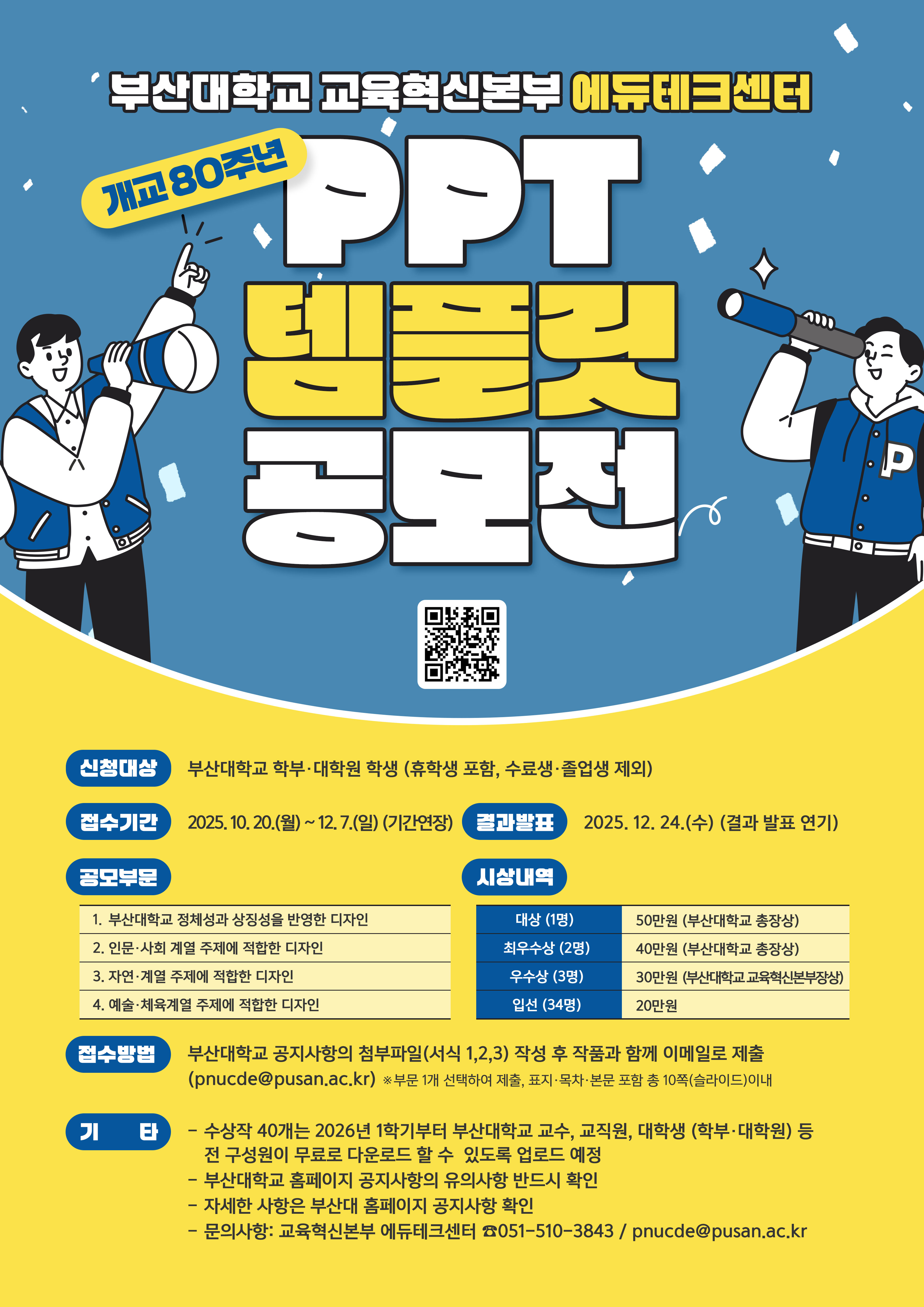 fnctId=bbs,fnctNo=4167 [홍보·안내] [에듀테크센터] 부산대학교 80주년 기념 PPT 템플릿 공모전(기간연장) 안내 date 2025.12.01 name 고고학과 e-mail view 308 첨부파일 1. 부산대학교 80주년 기념 PPT 템플릿 공모전 개최 안내(기간연장).hwpx 말머리 분류 전체 학사 졸업 장학·멘토링 취업 내규 교류·파견 홍보·안내 RSS 2.0 2997 건 게시물 검색 검색하기 제목 작성자 게시글 리스트 공지사항 번호 제목 작성일 첨부파일 조회수 전체공지 부산대학교 교직원 사칭 사기 사례 전파 및 피해 예방을 위한 안내 2025.12.18 1 전체공지 시월광장 넉넉한터 잔디 보호 및 재생을 위한 사용통제 안내 2025.12.18 0 공지 2026년 2월 졸업 예정자에 대한 표준외국어능력시험 성적표 제출 마감일 안내 2025.12.18 0 전체공지 2026학년도 1학기 학·석(박)사 (통합)연계과정 학생 및 전환 희망 학생 모집 안내 2025.12.17 3 전체공지 2026학년도 1학기 휴·복학 신청 기간 안내 2025.12.17 0 공지 2026학년도 부산대학교 예비 신입생 캠퍼스 투어 신청 안내 2025.12.10 2 전체공지 [채널PNU] [알쓸부잡] EP 08. 부산대 박물관 학예사(강나리 동문) 편 안내 2025.11.27 0 전체공지 시험 질서 확립을 위한 안내문 2025.11.26 0 공지 2026년 1학기 국가장학금 1차 신청 안내 2025.11.18 2 공지 2026학년도 1학기 국가근로장학금 1차 신청 안내 2025.11.18 2 전체공지 2025학년도 겨울방학 기간 인문관 공사에 따른 시설물 사용제한 안내 2025.11.14 0 전체공지 (교육부) 대학생 해외 취업사기 피해 예방을 위한 제작 영상 안내 2025.11.10 0 전체공지 대학생 해외 취업 피해 예방을 위한 안내 2025.10.27 3 전체공지 개인형 이동장치(PM) 안전운행 수칙 안내 2025.10.21 0 전체공지 캠퍼스 내 무등록 오토바이 운행 근절을 위한 단속 시행 2025.10.13 0 전체공지 [국립대육성] 2025학년도 '잡플래닛(Job planet) 제휴 대학 서비스’ 이용 안내 2025.08.26 2 전체공지 성적증명서 내 학기별 성적백분위 정보 표기 개선 시행 알림 2025.07.09 0 공지 전공선택 교과목 수강인원 제한 및 증원 관련 안내(250731) 2025.06.23 0 공지 2025학년도 2학기 교육과정 개정(이론실습시수 변경) 안내 2025.06.23 0 전체공지 부산대학교 교직원 사칭 사기 기승 주의 당부 2025.06.12 0 전체공지 [부대신문] [효원人side] “박물관 전시는 ‘종합 예술’이죠” 장용준 동문 기사 안내 2025.06.12 0 전체공지 모바일 전용 부산대학교 스마트 앱 긴급출동[에스원] 시스템 신설 알림 2025.05.16 0 전체공지 [PNU FOCUS] 고고학과 이명훈 박사과정생 영남고고학회 우산학술상 수상 2025.04.14 0 공지 「부산대학교 학생역량 인증서」발급 시행 안내 2025.03.10 1 전체공지 [인권센터] PNU 폭력예방교육 이수 안내 2025.02.24 0 전체공지 고고학과 배진성 교수 『거석의 문화사 - 지석묘와 거석신앙 -』 저서 출간(2025. 1. 5.) 2025.02.03 0 공지 2025학년도 1학기 교육과정 개정(신설·명칭변경·이수학기 변경) 안내 2025.01.04 0 전체공지 캠퍼스 긴급상황 발생 시 행동요령 2024.08.29 0 전체공지 출석 인정에 관한 사항 안내(출석 인정 신청 기한) 2023.12.11 0 전체공지 인터넷증명발급시스템(써트피아) 이용안내 등 증명서 발급 관련 알림 2023.08.31 2 공지 학생역량지원시스템 어학 성적 업로드 방법 2023.01.10 0 공지 고고학과 학부 졸업 요건 제출 일정 안내(241114 ......) 2022.03.15 0 공지 교육과정 개정으로 인한 수강 안내(문화유산답사(Ⅰ·Ⅱ·Ⅲ) 및 디지털고고학) 2022.02.09 0 공지 고고학과 부전공 필수과목 안내 2022.01.28 0 공지 고고학과 학부 졸업 요건 안내(241114 ......) 2022.01.27 2 2997 [홍보·안내] 부산대학교 교직원 사칭 사기 사례 전파 및 피해 예방을 위한 안내 새글 2025.12.18 1 12 2996 [홍보·안내] [금정경찰서]보이스피싱 예방을 위한 안내 새글 2025.12.18 0 8 2995 [홍보·안내] [글로컬대학30] 지역민을 위한「릴레이 창업체험 교육」안내 새글 2025.12.18 1 9 2994 [홍보·안내] 시월광장 넉넉한터 잔디 보호 및 재생을 위한 사용통제 안내 새글 2025.12.18 0 7 2993 [홍보·안내] 2026년도 「병역판정검사 일자·장소 본인선택」 및 「20세 검사 후 입영」 신청 안내 새글 2025.12.18 2 9 2992 [학사] 2026년 2월 졸업 예정자에 대한 표준외국어능력시험 성적표 제출 마감일 안내 새글 2025.12.18 0 11 2991 [학사] 2026학년도 1학기 학·석(박)사 (통합)연계과정 학생 및 전환 희망 학생 모집 안내 새글 2025.12.17 3 59 2990 [홍보·안내] 표절예방프로그램 ‘턴잇인(Turnitin)’ 클래스 변경 이용 안내 새글 2025.12.17 1 12 2989 [홍보·안내] 'KT AIVLE School 9기' 참가 우수 교육생 추천 안내 새글 2025.12.17 3 12 2988 [학사] 2026학년도 1학기 휴·복학 신청 기간 안내 새글 2025.12.17 0 15 2987 [교류·파견] 2026학년도 1학기 정규학기 해외파견 자비 프로그램 선발 안내 새글 2025.12.17 3 12 2986 [홍보·안내] 2026 新조선통신사 - 유스(Youth) 조선통신사 한일 대학생 교류사업 안내 새글 2025.12.17 1 20 2985 [취업] 한국수력원자력 2025 하반기 채용상담회 안내(12_15_월) 새글 2025.12.15 0 25 2984 [홍보·안내] [HUSS} 디지털 고고학 국내와 사례와 미래 전망 특강 안내 2025.12.12 0 25 2983 [홍보·안내] 2025학년도 2학기 기말고사 기간에 따른 방문 제한 안내(12/15~12/19) 2025.12.12 0 23 2982 [홍보·안내] 2026학년도 수시전형 합격자 대상「PNU Pre-start Program」운