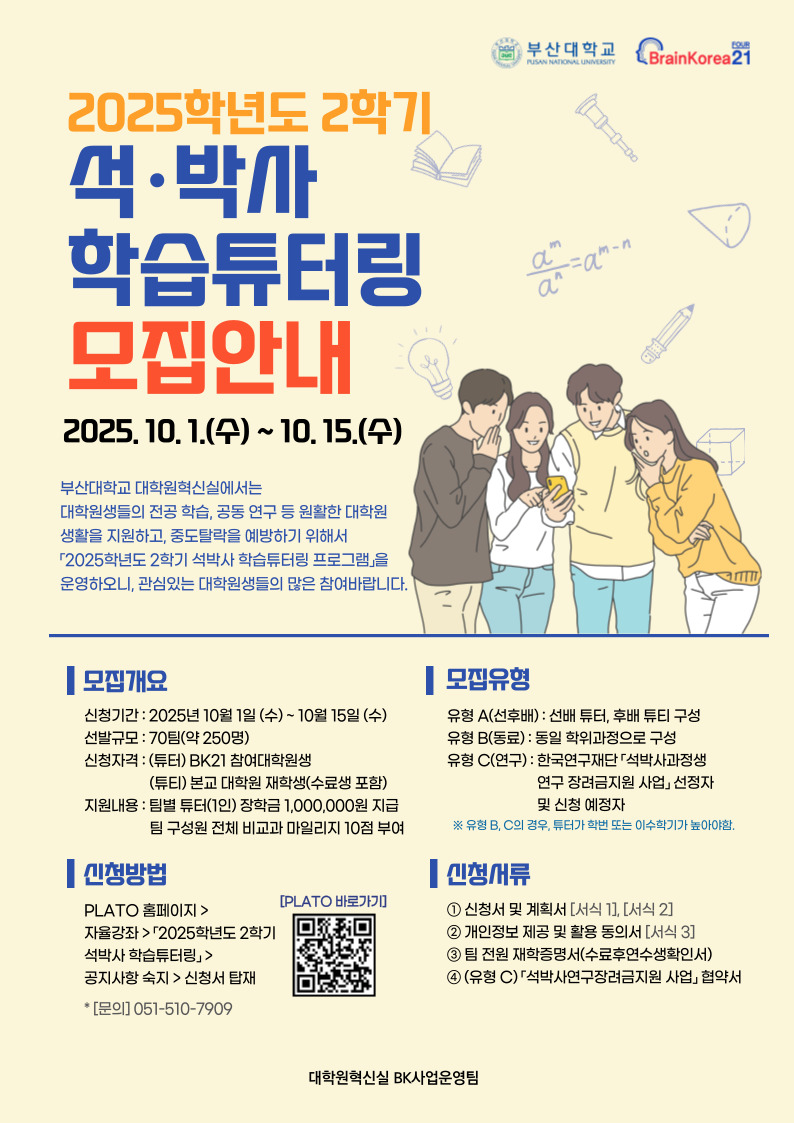 fnctId=bbs,fnctNo=16619 [홍보·안내] [BK21 대학원혁신] 「2025학년도 2학기 석·박사 학습튜터링」 운영 안내 date 2025.10.12 name 고고학과 e-mail view 7 첨부파일 (붙임 2) 2025학년도 2학기 석박사 학습튜터링 관련 서식.hwp 미리보기 (붙임 1) 2025학년도 2학기 석박사 학습튜터링 프로그램 운영 안내.pdf 미리보기