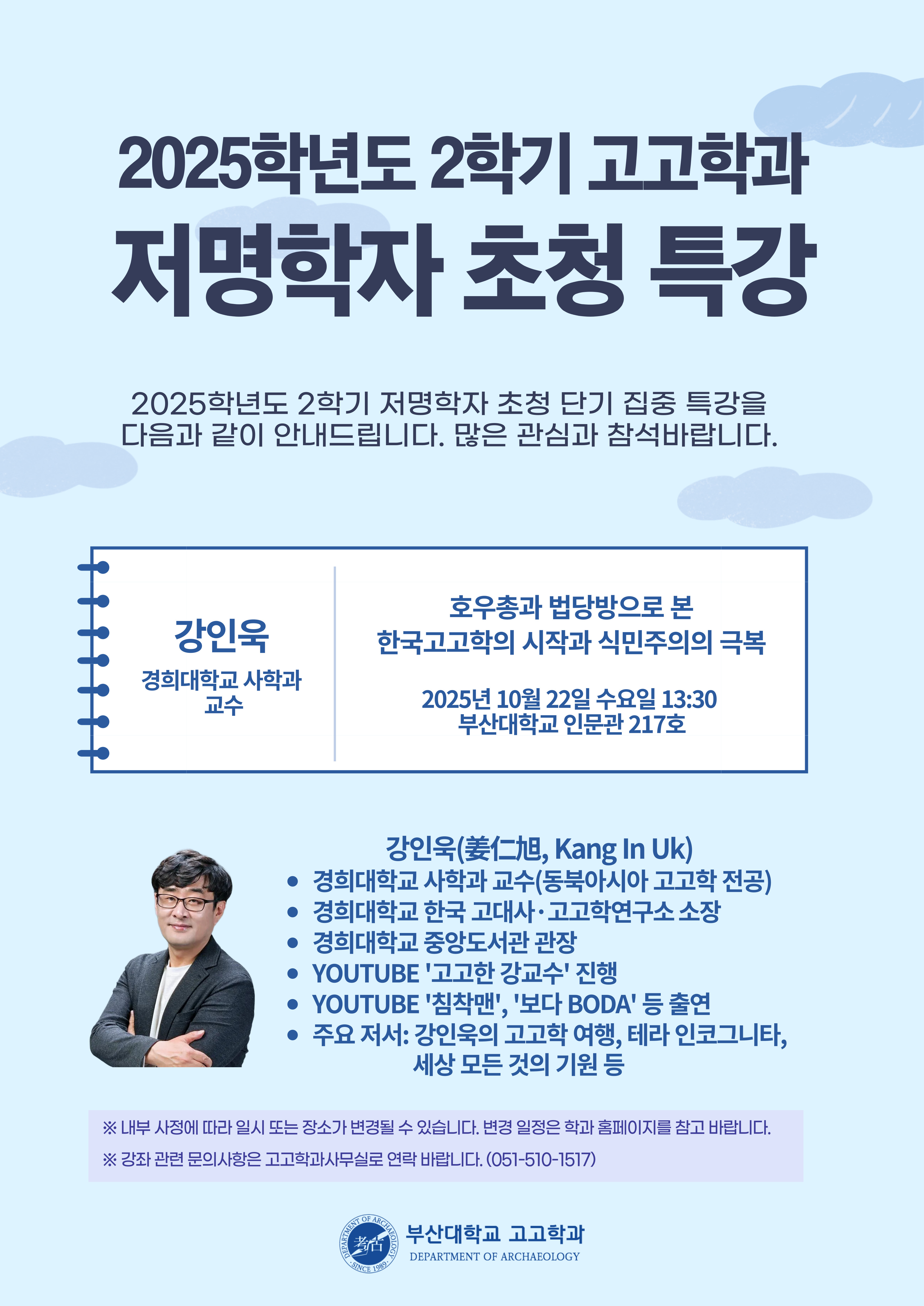 fnctId=bbs,fnctNo=16619 [홍보·안내] 2025학년도 2학기 고고학과 저명학자 초청 특강 안내 <호우총과 법당방으로 본 한국고고학의 시작과 식민주의의 극복> date 2025.10.22 name 고고학과 e-mail view 15 첨부파일 첨부파일이(가) 없습니다.