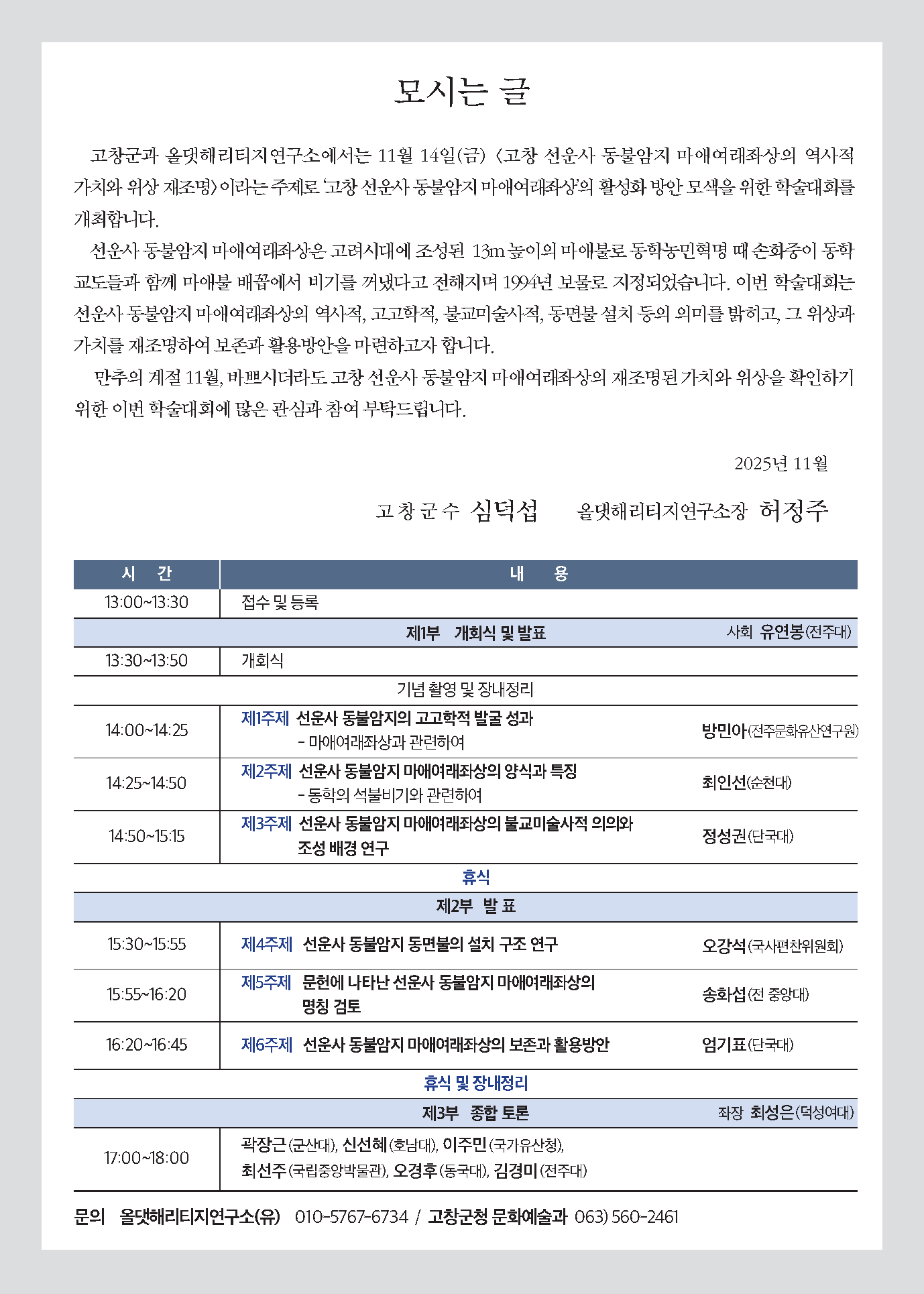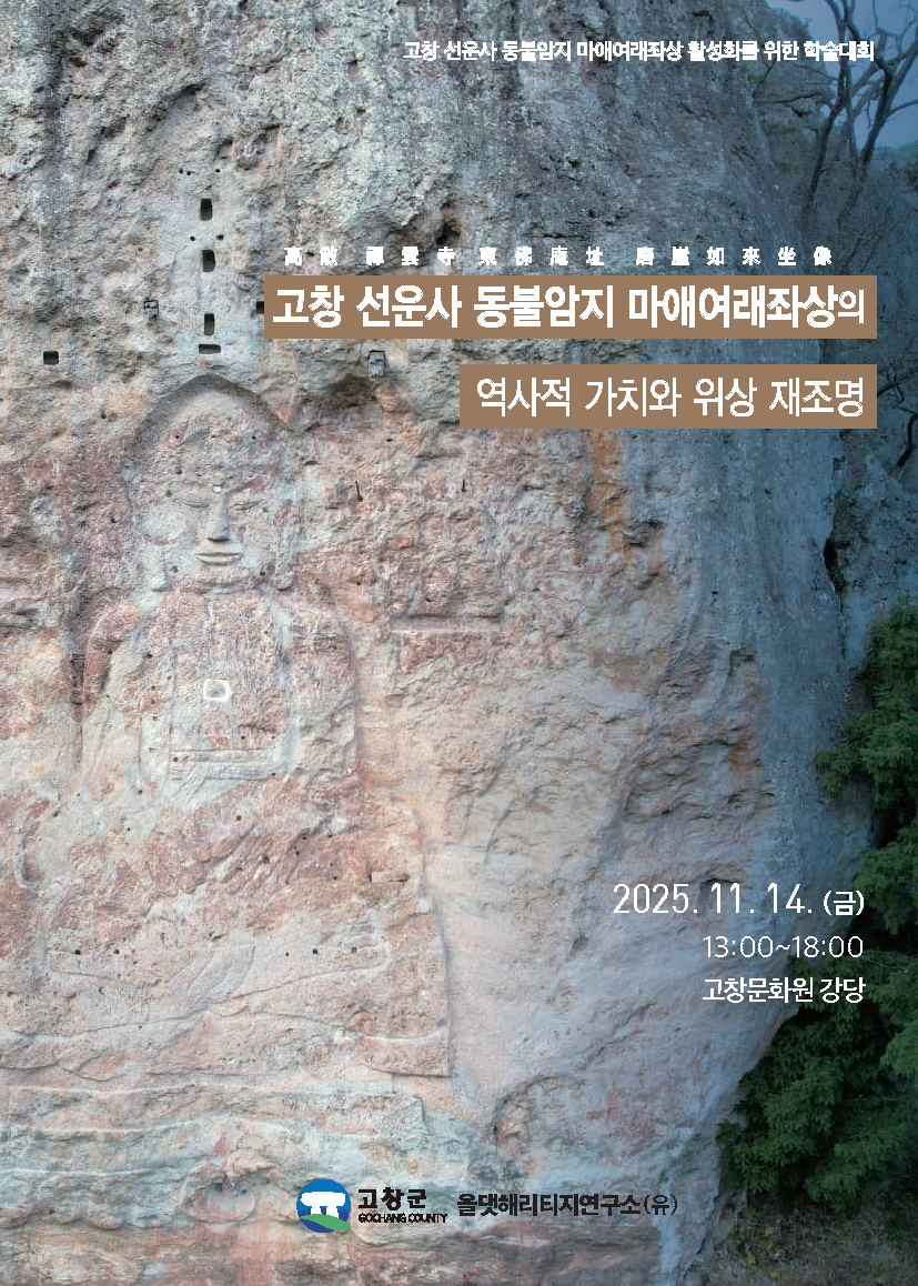 fnctId=bbs,fnctNo=16619 [홍보·안내] 「고창 선운사 동불암지 마애여래좌상의 역사적 가치와 위상 재조명 학술대회」개최 안내 date 2025.11.10 name 고고학과 e-mail view 12 첨부파일 첨부파일이(가) 없습니다.