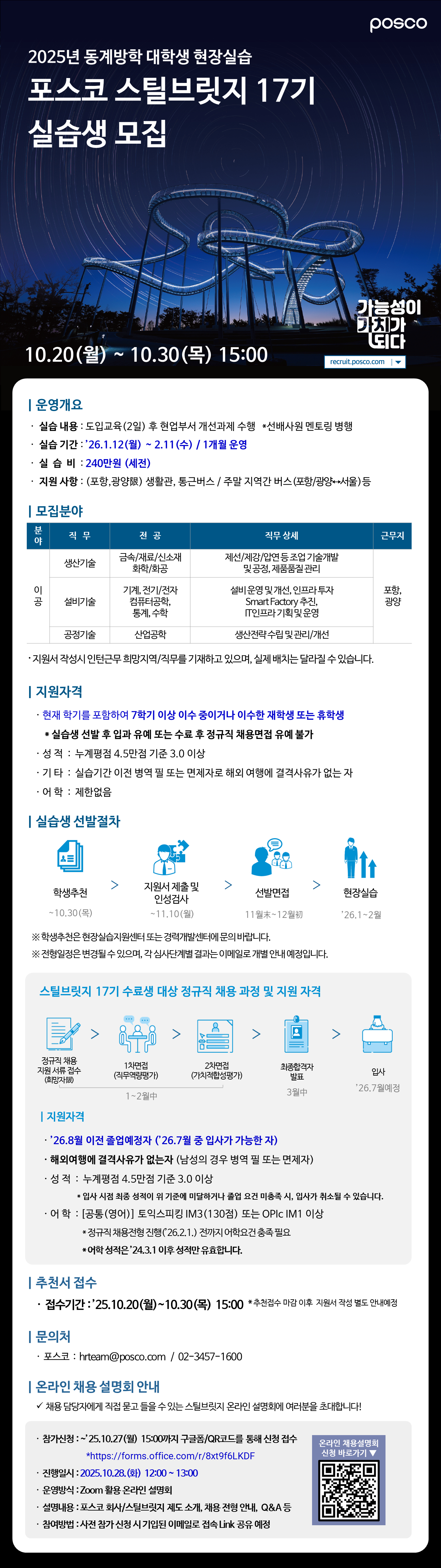 [홍보·안내] 25년 동계 포스코 스틸브릿지(대학생 현장실습 프로그램) 참여 안내